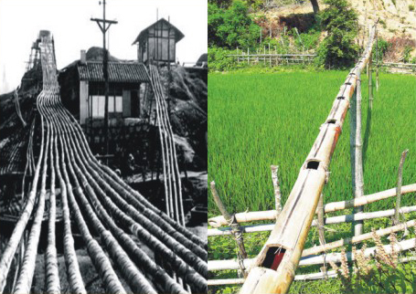 竹制管道 | 上世纪四十年代,自贡盐场架设的竹制卤水枧密如蛛网,总长度达二三百公里。 二十世纪六十年代以前,在盐都自贡,纵横交错巨蟒般的输卤枧管, 带着从卤井里汲出的卤水,越过青青的田野和陡峭的山坡, 跨过开阔的河流,把卤水送到十多公里外的制盐灶房,熬制成雪白的盐。 新中国建立后,随着科技技术的进步,卤水逐步改用钢管输送,竹制卤枧便消失了。 |