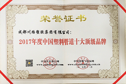 2017年12月,我司荣获由中国企业排行网、中国采购招标网联合颁发的“2017年度中国塑料管道十大顶级品牌”殊荣。