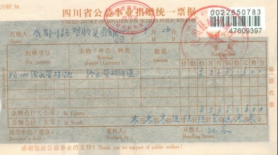 川路集团再次向汶川捐赠5.66万元物资