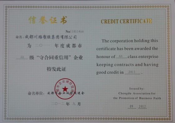 9月,成都市工商行政管理局依照《四川省和成都市“守合同重信用”企业考核认定办法》,评定、授予我司“2011年度成都市AA守合同重信用”企业荣誉称号。..