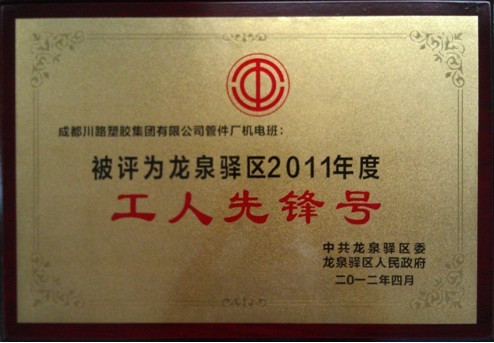 近日,我集团“管件厂机电班”,在2012年龙泉驿区开展的“金牌工人”、“能工巧匠”及“工人先锋号”评选活动中,被评为龙泉驿区2011年度“工人先锋号”称号,该称号是由中共龙泉驿区委、龙泉驿区人民政府联合授予,并颁发了奖牌。