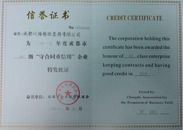 据“成工商办[2011]171号”文件,成都市企业诚信促进会根据《四川省合同监督条例》和《成都市“守合同重信用”企业考核认定办法》,授予成都川路塑胶集团有限公司为2010年度成都市AA级“守合同重信用”企业荣誉称号,同时在成都市企业信用信息网(http://www.cdcredit.gov.cn/)予以公示。
