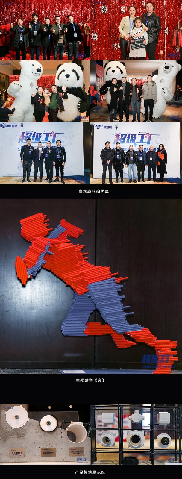 本次年会还有一大亮点就是增设了趣味拍照区,现场有丰富的道具、人偶,拍照方式有趣、新颖。四川省美术学家协会会员林朋利用川路管材特意为本次年会创作的一座名叫《奔》的雕塑,寓意川路速度、力量和希望。