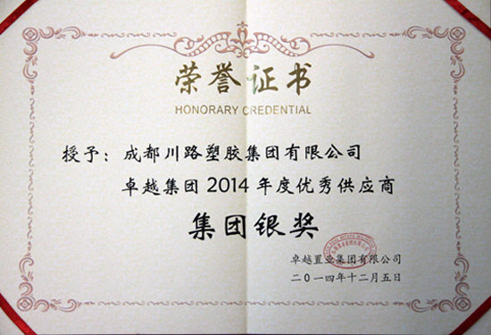 图3:川路荣获“卓越集团2014年度优秀供应商集团银奖”荣誉证书