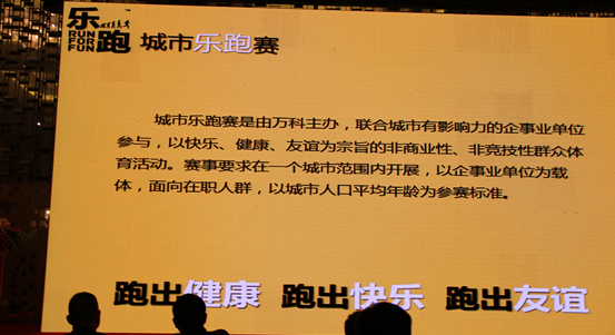 最后,由万科主办的以“快乐、健康、友谊”为宗旨的“城市乐跑赛”在全国范围内展开,意在“跑出健康、跑出快乐、跑出友谊”。