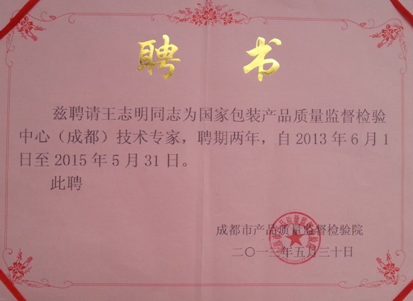 5月31日,我司质量总监王志明被成都市产品质量监督检验院聘为国家包装产品质量监督检验中心(成都)技术专家。据悉,此次所聘技术专家来自高等院校教授、科学院院士、工程院院士等,我司质量总监是唯一入选的企业代表。