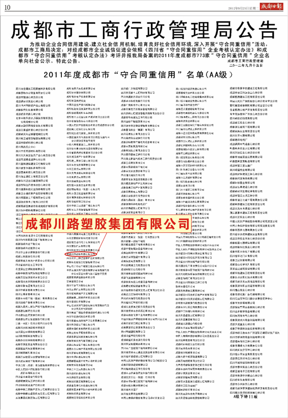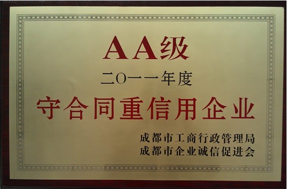 9月,成都市工商行政管理局依照《四川省和成都市“守合同重信用”企业考核认定办法》,评定、授予我司“2011年度成都市AA守合同重信用”企业荣誉称号。